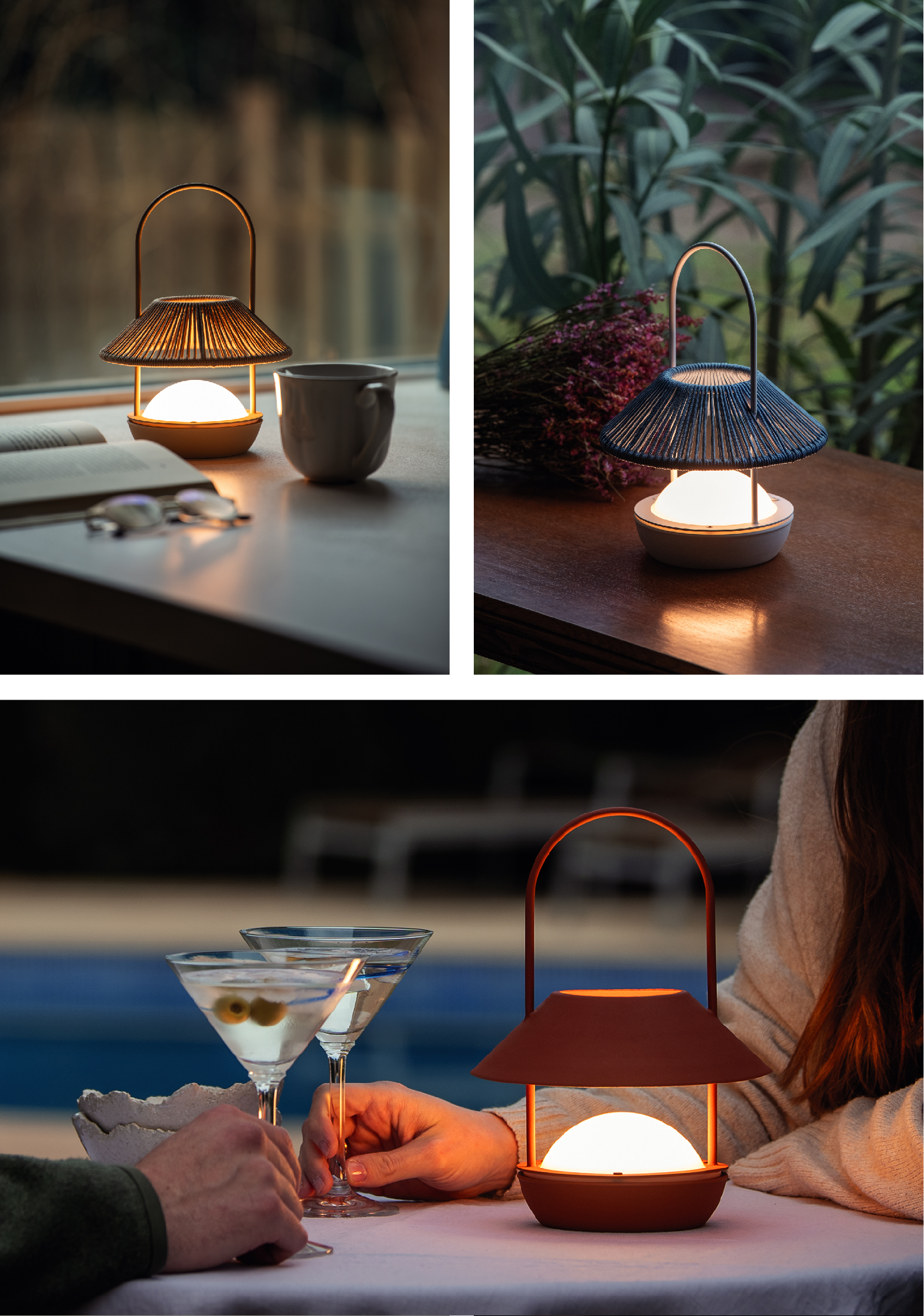 Lámpara potátil de exterior que evoca la nostalgia de un candil clásico, pero con un toque minimalista, jugando con las formas primarias que generan la imagen mental de un candil. Su estructura está diseñada en líneas limpias y puras, manteniendo la silueta formal del candil.