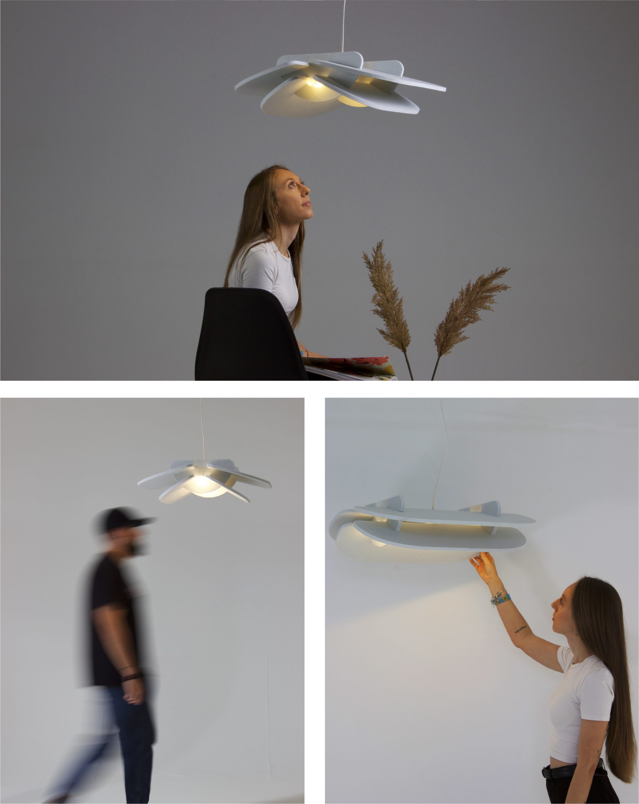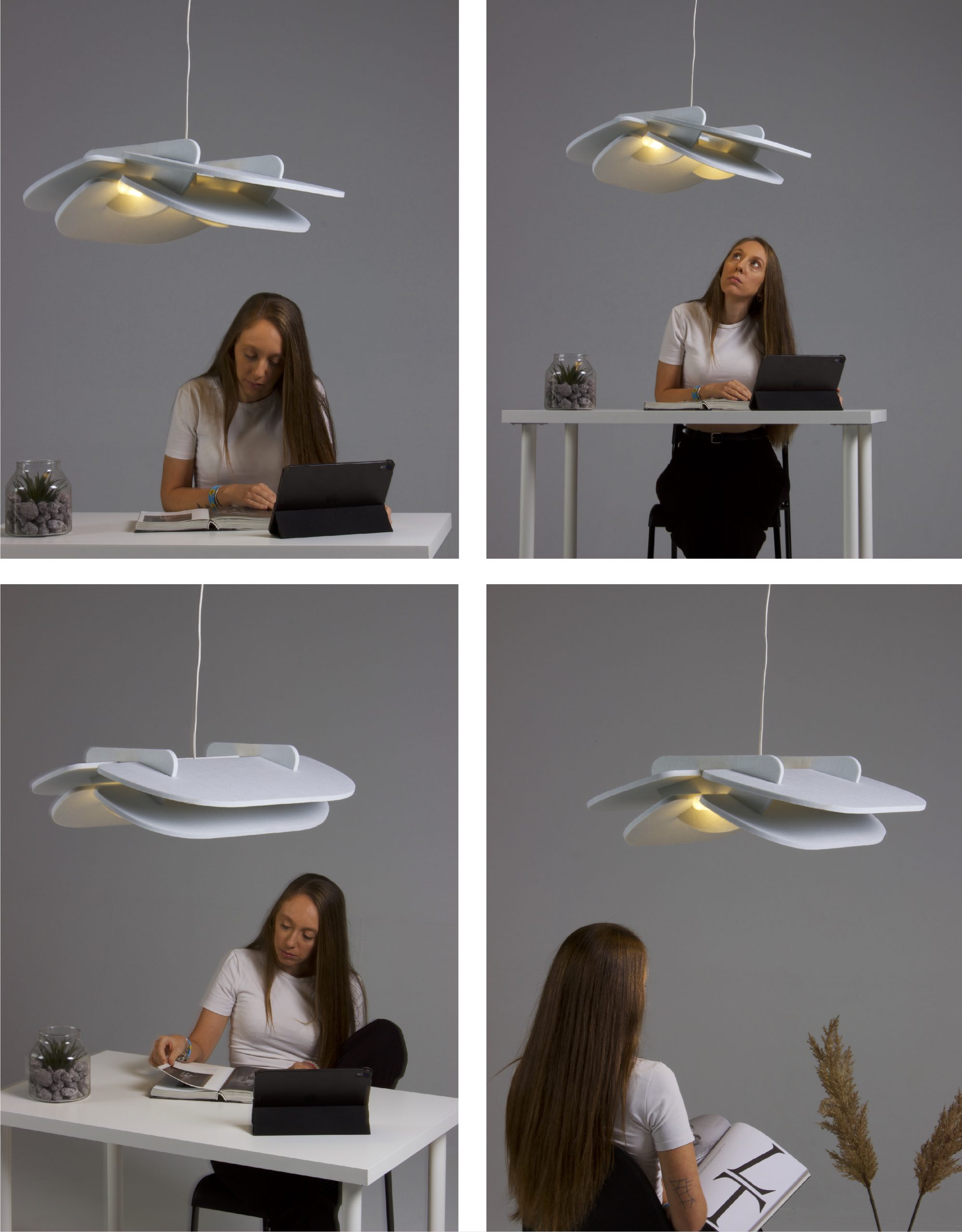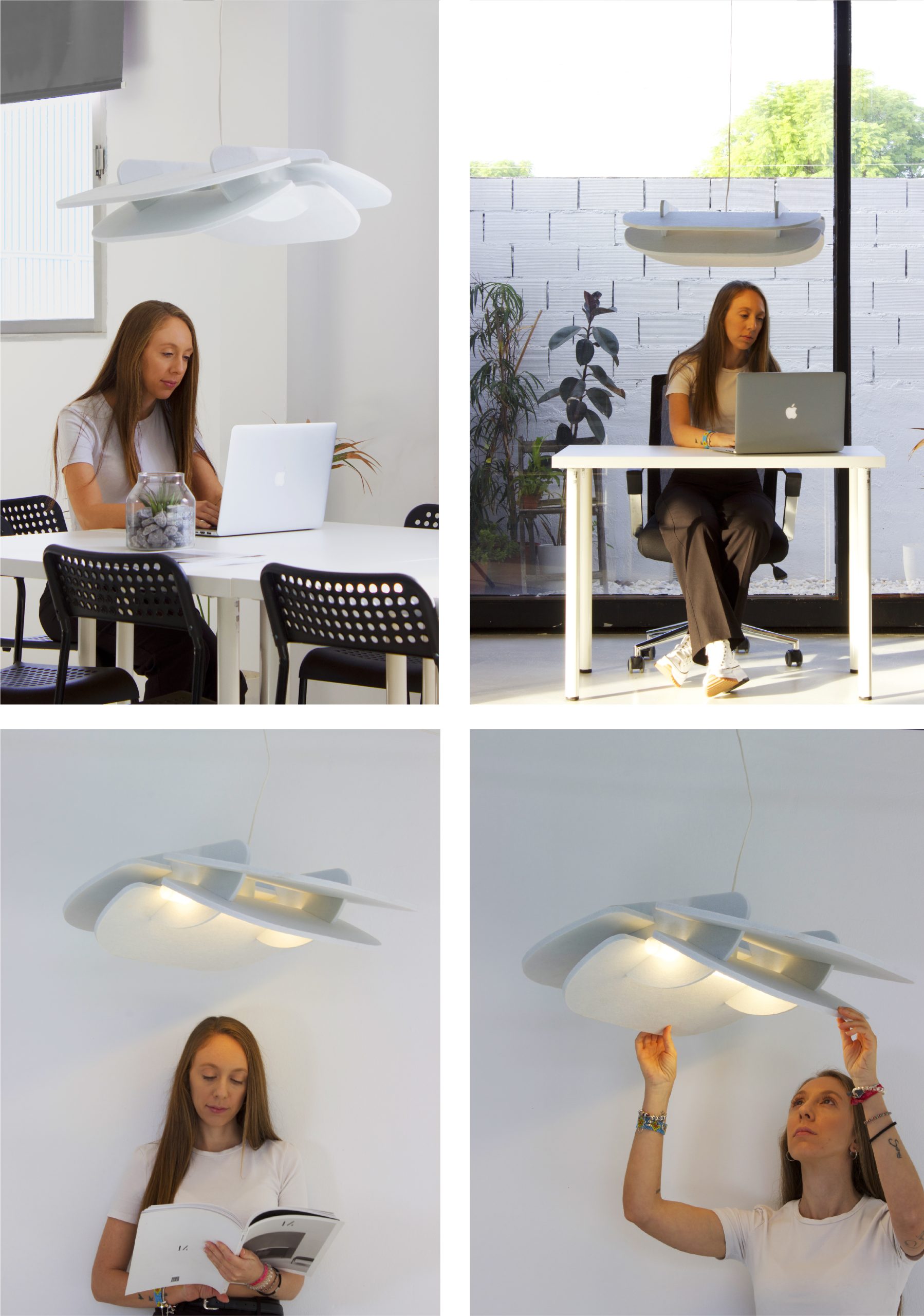 La lámpara acústica Stella combina iluminación y absorción sonora en un diseño inspirado en la elegancia y ligereza de las libélulas. Su estructura se compone de alas extendidas con formas orgánicas, elaboradas con materiales fonoabsorbentes que reducen el ruido ambiental, mejorando la acústica del espacio.