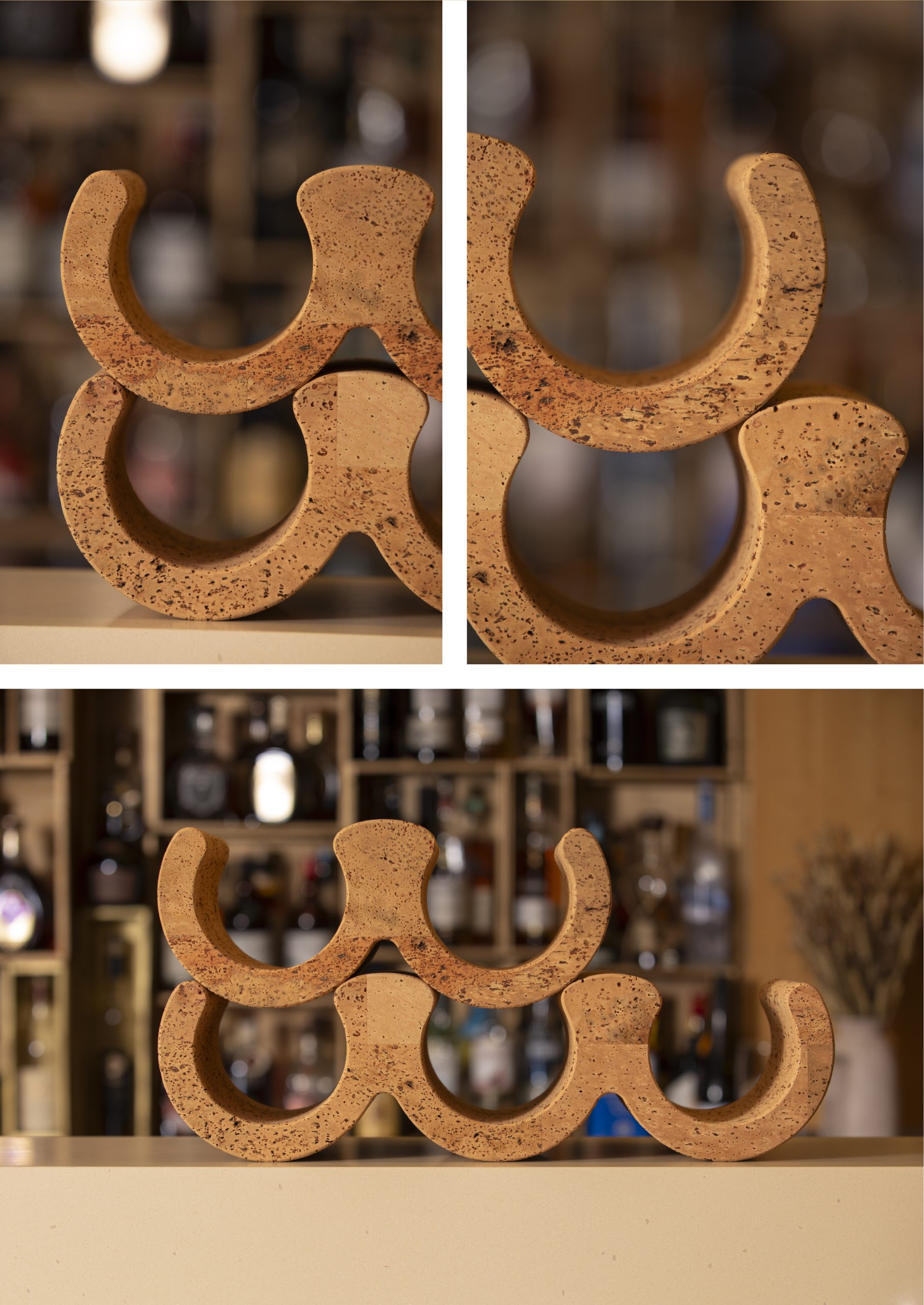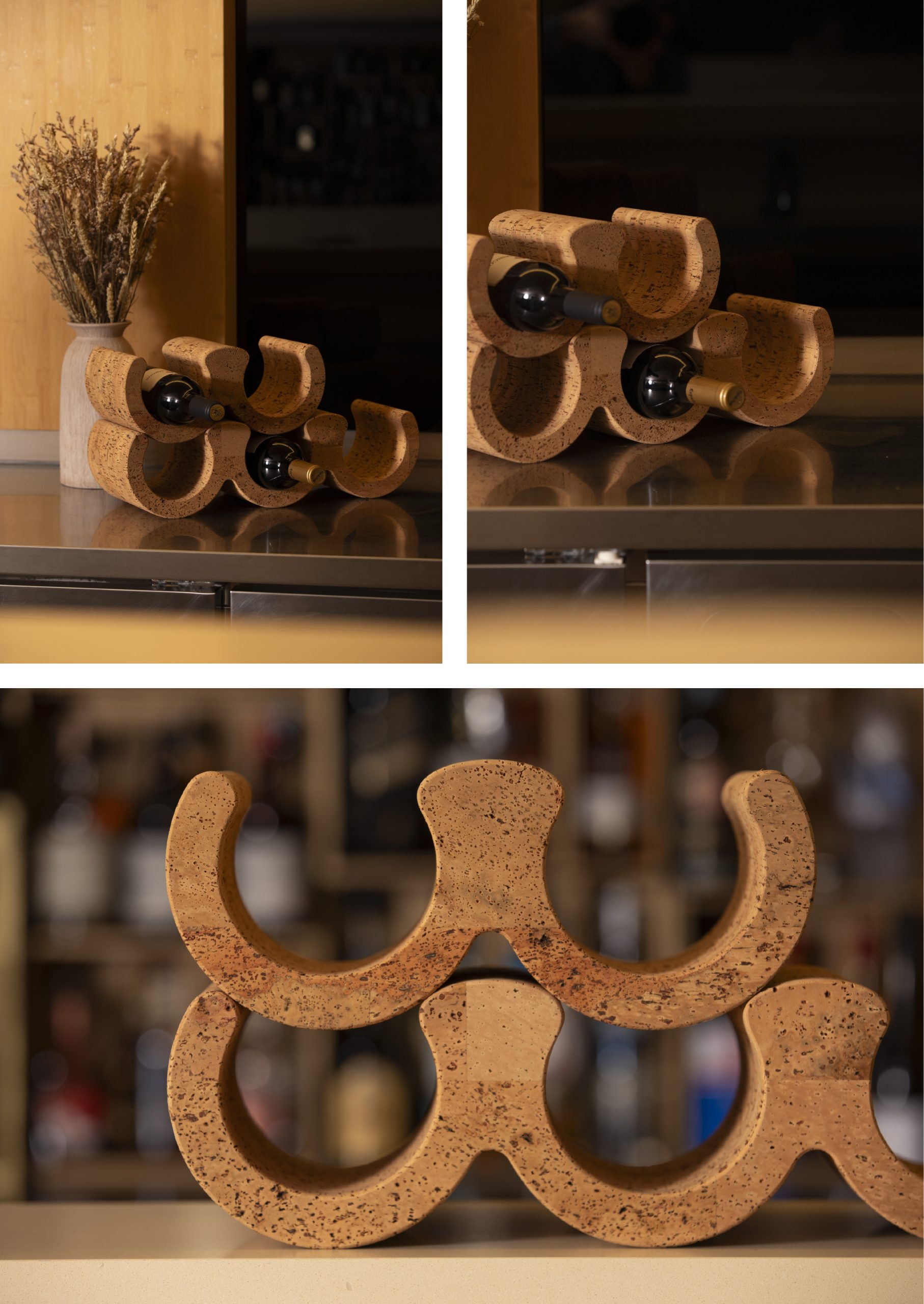 Cada curva ha sido diseñada para aportar estabilidad, permitiendo que las botellas descansen en una disposición dinámica pero segura, como si flotaran sobre una ola suspendida en el tiempo.