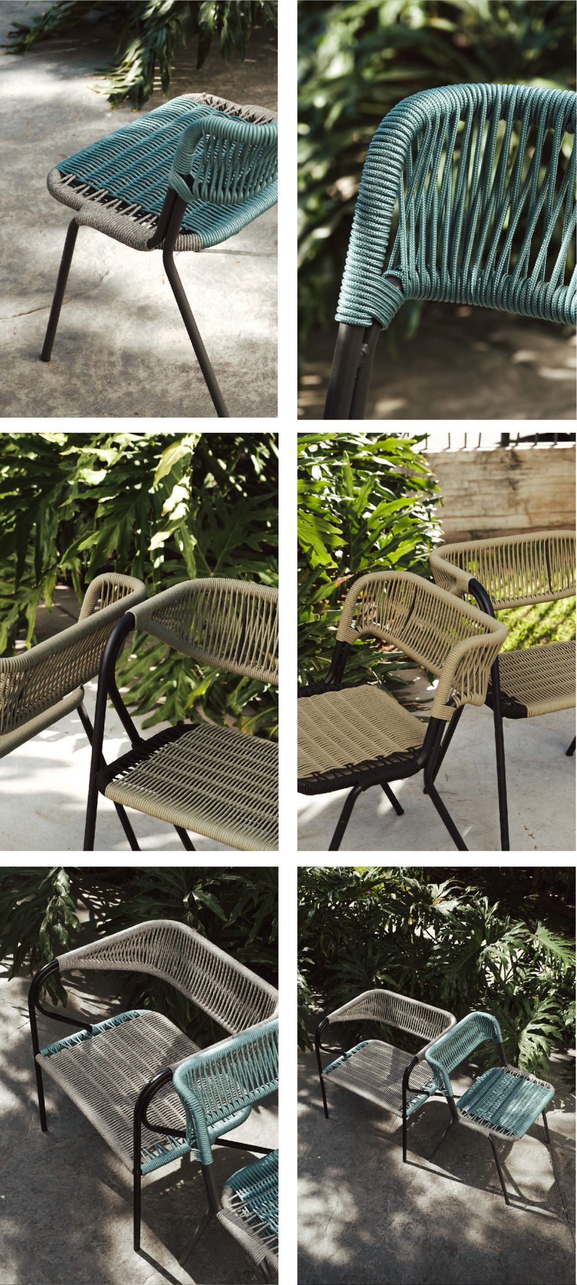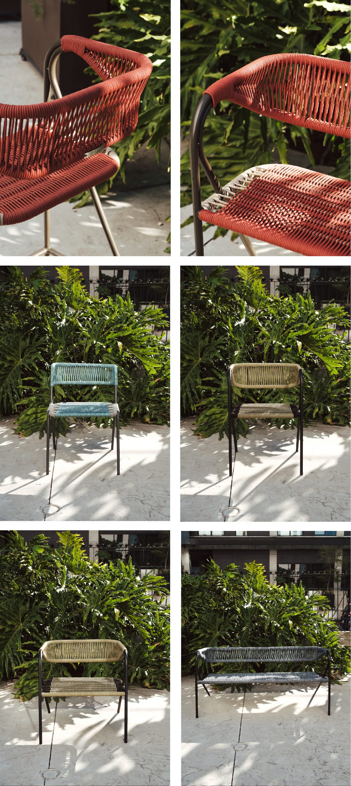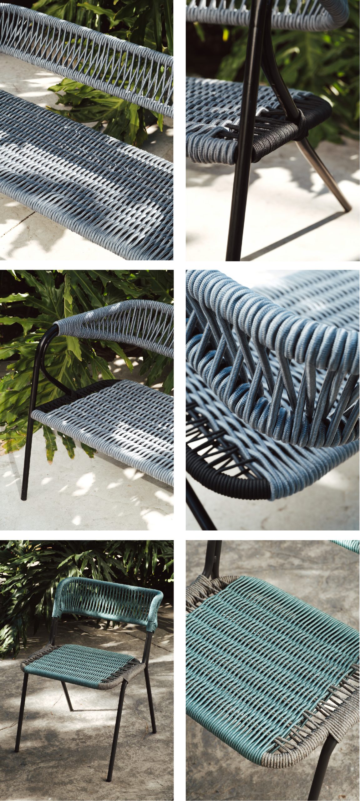El diseño combina una estructura ligera de líneas limpias con un tejido manual que aporta calidez y textura. Cada asiento y respaldo está cuidadosamente entrelazado, creando una superficie flexible y resistente que dialoga con el entorno exterior. La repetición del trenzado no solo cumple una función ergonómica, sino que también introduce un ritmo visual que evoca tradición artesanal reinterpretada en clave contemporánea.