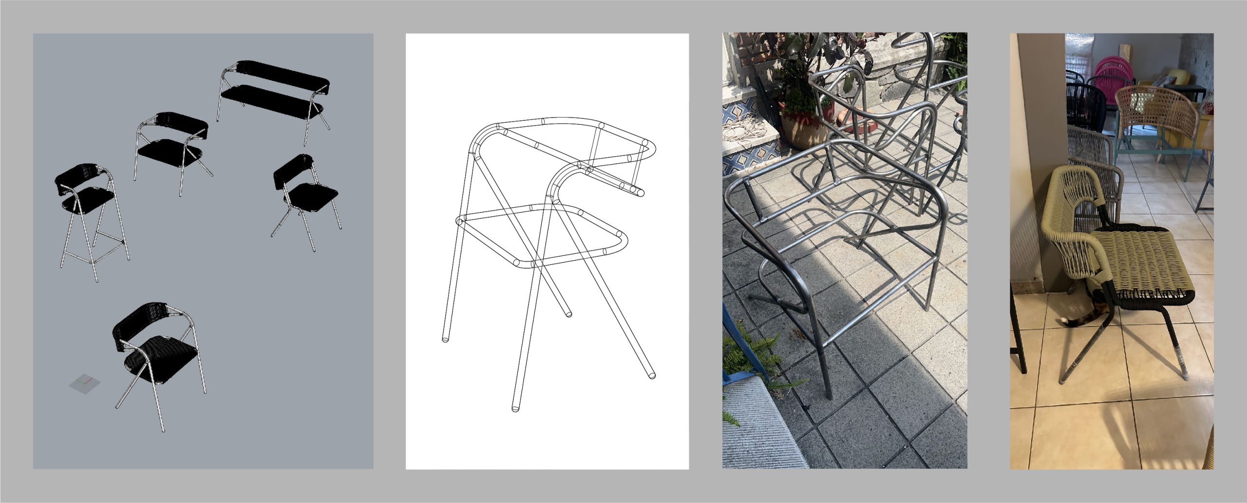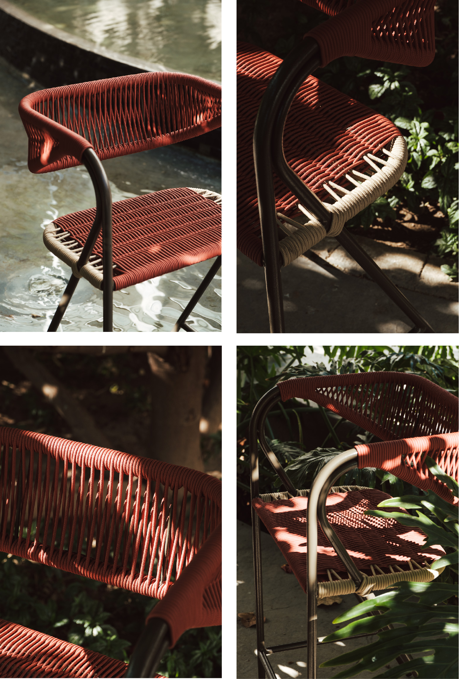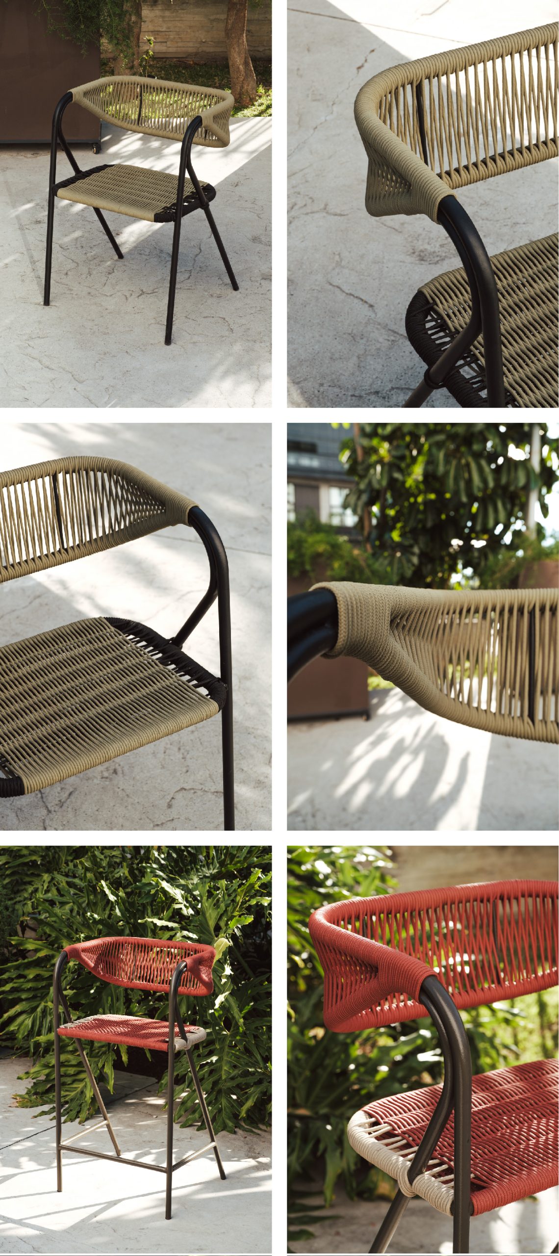 El diseño combina una estructura ligera de líneas limpias con un tejido manual que aporta calidez y textura. Cada asiento y respaldo está cuidadosamente entrelazado, creando una superficie flexible y resistente que dialoga con el entorno exterior. La repetición del trenzado no solo cumple una función ergonómica, sino que también introduce un ritmo visual que evoca tradición artesanal reinterpretada en clave contemporánea.